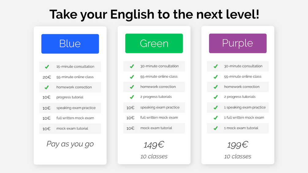 One 55 minute class via Zoom, including individual work (homework) and correction after the class. Your first class includes a 15-minute consultation.